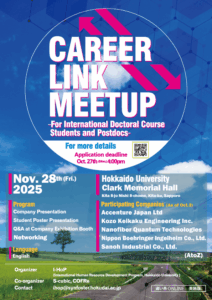 I-HoP(Hokudai International Human Resource Development Program)は、北海道大学の博士課程学生およびポスドクのためのキャリア形成支援プログラムを英語で提供しています。トランスファラブルスキル向上のためのセミナーや、文化的背景が異なる留学生向けの日本就職のための情報提供のセミナーの実施、日本語習得支援やキャリアに関する個別の相談を行うほか、留学生のキャリアに関する調査などを行っています。